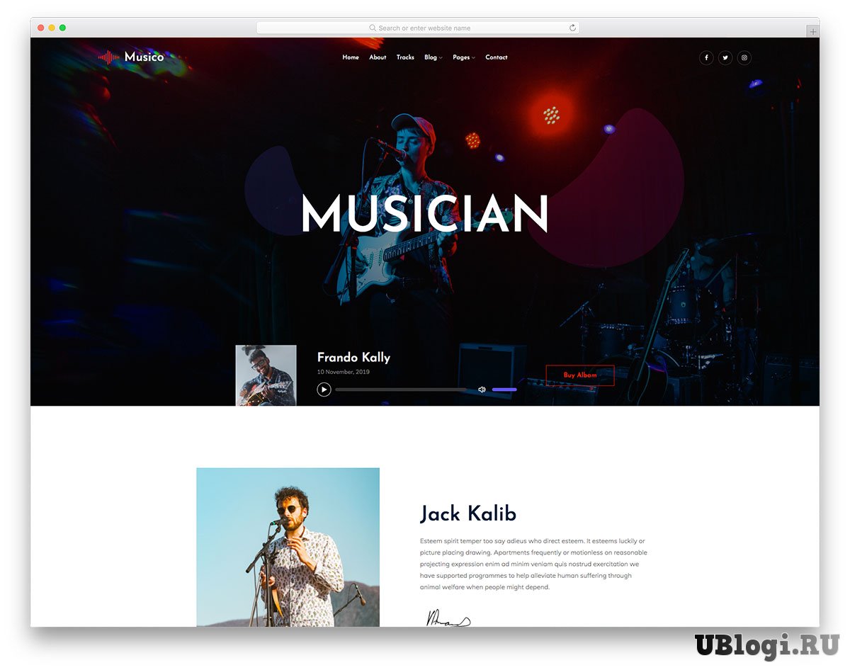 При поиске креативного бесплатного дизайна шаблона сайта музыканта не тратьте больше времени и воспользуйтесь Musico. Имейте в виду, что чистота и утонченность Musico обеспечивают легкую адаптацию к разнообразию различных вкусов и жанров. В дополнение к этому, вы также можете настроить его дальше и заставить его точно