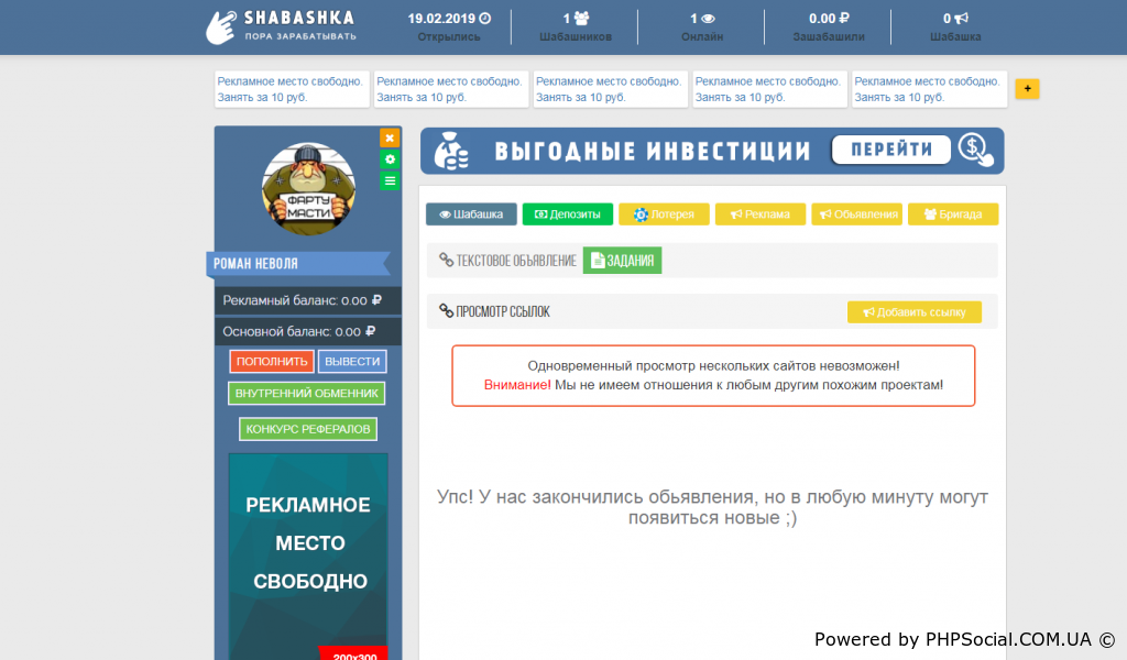 В скрипте есть лотерея,инвестиции, сёрфинг сайтов, задания