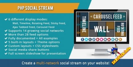 PHP Social Stream v2.10.2 – лучший выбор для тех, кто ищет простой способ объединить все свои действия в социальных сетях в один социальный поток и отобразить их на своих веб-сайтах. Используя этот скрипт, вы можете создать стильную увлекательную ленту социальных сетей, включая несколько учетных записей и страниц социальных сетей, и можете отображать их в 6 различных макетах, включая стену, временную шкалу, карусель, вращающуюся ленту, ленту с вкладками Ajax и липкую ленту. Он поддерживает 14 социальных сетей и включает в себя около 29 вариантов подачи.